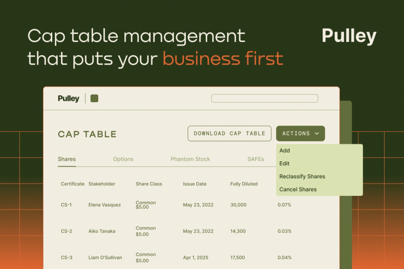 Putting it all on the table: Pulley helps you cook up five-star cap table management. Say goodbye to costly mistakes with workflows, recordkeeping, and controls that ensure your compliance requirements are completed correctly and on time—with the transparency needed to be fully defensible. Try it here.